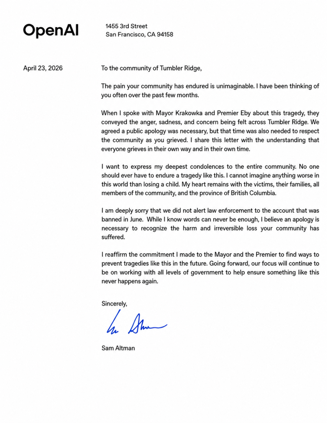 https://tumblerridgelines.com/2026/04/24/openai-apologizes-to-tumbler-ridge/