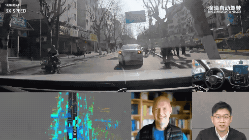 2021 年在上海,滴滴自动驾驶首次实现连续 5 小时无接管连续行驶,这是国内自动驾驶的一个里程碑事件。图为时任滴滴自动驾驶公司 COO 孟醒,与谷歌 “无人车之父”Sebastian Thrun 的对话,2021。