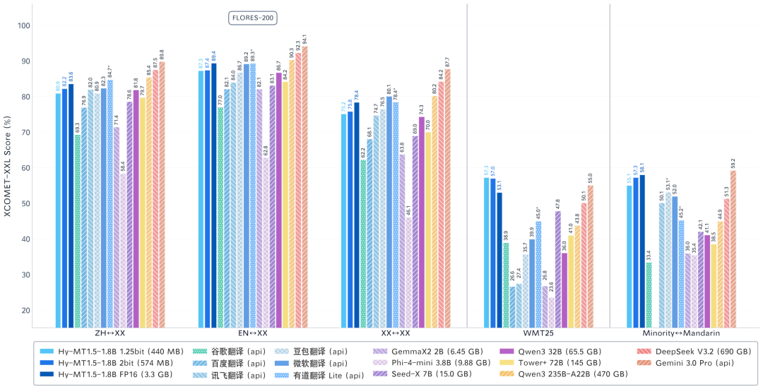 仅以 1.8B 参数量,Hy-MT1.5 实现了比肩商业翻译 API 和 235B 级大模型的翻译效果。在严格的评测基准中,其翻译质量不仅超越了谷歌翻译等主流系统,更证明了在高效优化下,轻量级模型能够迸发出令人印象深刻的翻译能力。