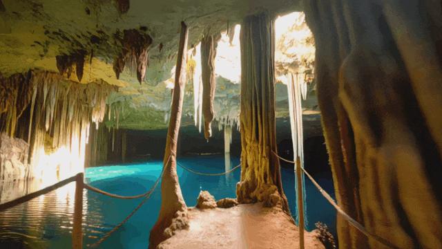 提示:在墨西哥的美丽、光线柔和的天然井中,第一人称视角镜头。水清澈蔚蓝,闪烁着午后阳光的光芒。色彩温暖,阳光呈「魔幻时刻」(magic hour)风格。高质量,电影感。