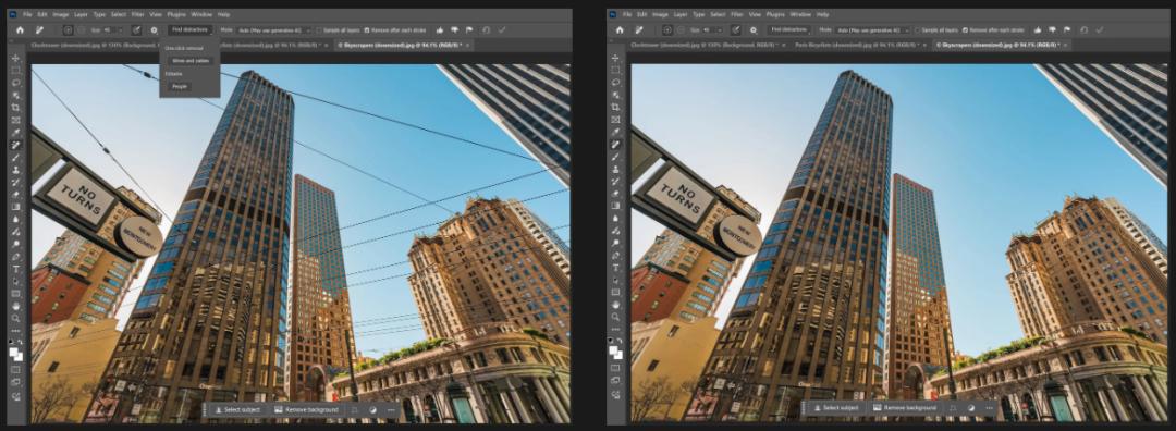 左:原图;右:天空中杂乱电线被AI移除,画面简洁清晰