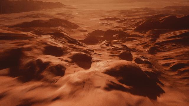 提示:电影般的无人机镜头,飞越广阔的红色火星地貌,地面在我们下方快速掠过,随着太阳开始升起,地平线呈红色。在镜头结束时,阳光照射到地平线上方。