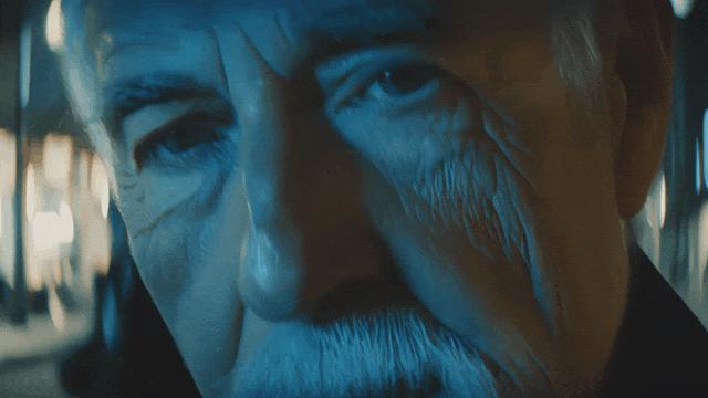 提示:夜晚街道中央,一位老年男子的电影级特写和细节丰富的肖像。光线氛围沉郁而富有戏剧性。色彩调性为蓝色阴影与橙色高光的对比。主角的皮肤纹理极其逼真细腻,毛孔清晰可见。动作微妙柔和。摄像机保持静止。胶片颗粒感。复古变形镜头。