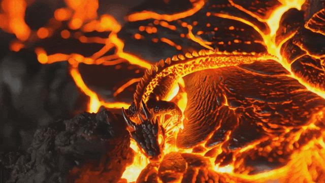 提示:微距镜头拍摄一只由熔岩组成的幼龙在火山内部爬行。