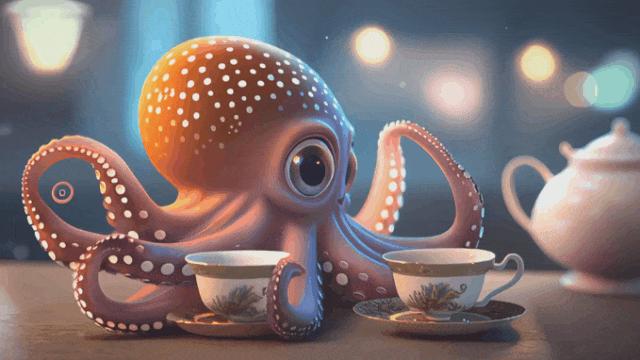 提示:可爱的章鱼宝宝,有着迷人的眼睛,每个触手都拿着一个茶杯,快乐地四处张望,3D渲染,Octane引擎,柔和光,梦幻般的背景虚化,浅景深,电影感。