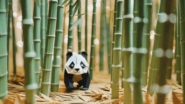 提示:一只纸质熊猫平静地走过一片折纸竹林,电影感,可爱,柔焦,背景虚化。
