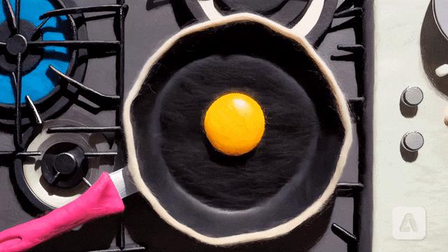提示:在阳光明媚的美丽厨房里,炉灶上的煎锅中正在烹饪一个鸡蛋,这是一个使用毛毡制作的定格二维动画。