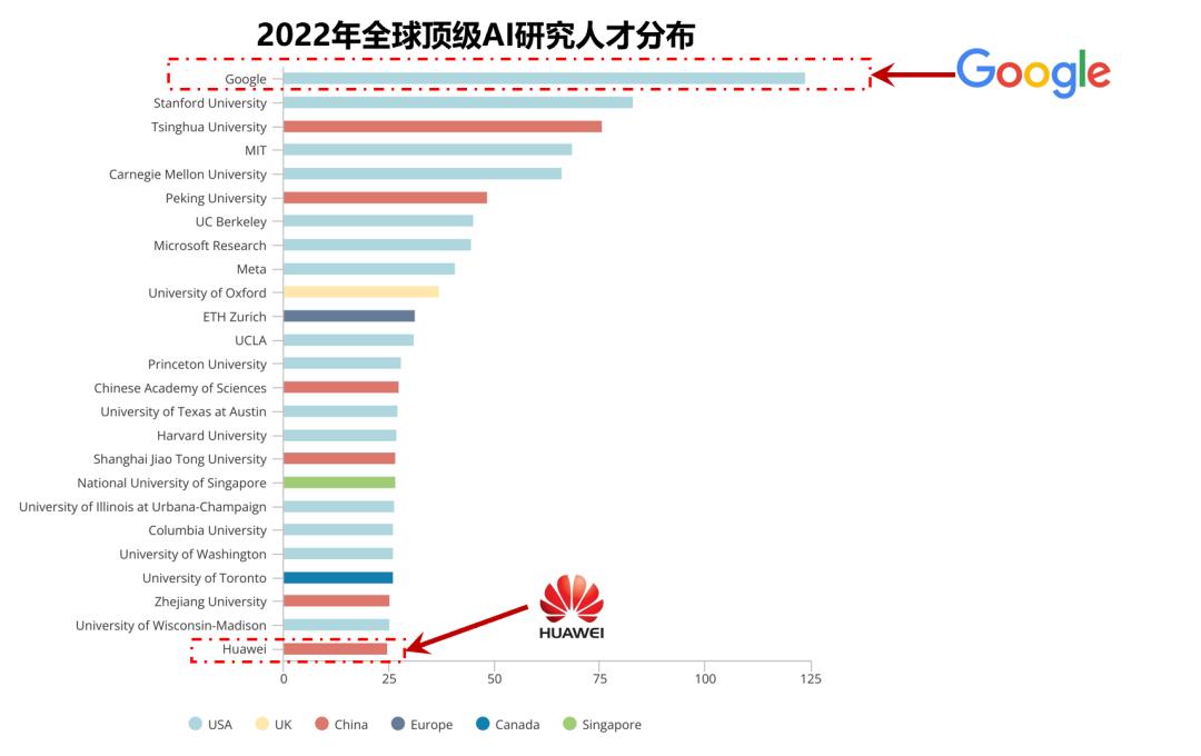 AI的竞争正也趋于白热化,国外的玩家如谷歌、Anthropic、微软、Meta、苹果正拼命角逐AI的头把交椅,国内的百度、阿里、腾讯、讯飞、月之暗面等企业也正在奋力追赶。上海交大的天才少年谢赛宁曾说,AI的竞争,“人才第一,数据第二,算力第三”。在人才方面,根据Macro Polo发布的《全球AI 人才追踪2.0》研究报告,中美是AI人才高地,其中尤以谷歌为最,谷歌拥有全球最多的顶级AI人才,其次是斯坦福大学、清华大学、麻省理工大学、卡耐基梅隆大学、北京大学等高校机构。企业层面,除谷歌外,美国的Meta也拥有不少顶级AI人才,位列第9。而国内企业中,唯有华为一家,拥有20+以上的顶级AI人才。