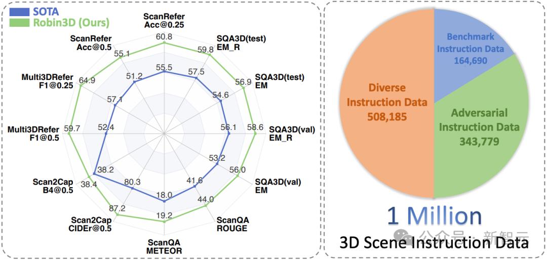 图1 Robin3D在构建的百万级数据上训练(右),最终在所有3D多模态数据集上的性能超过之前的SOTA(左)