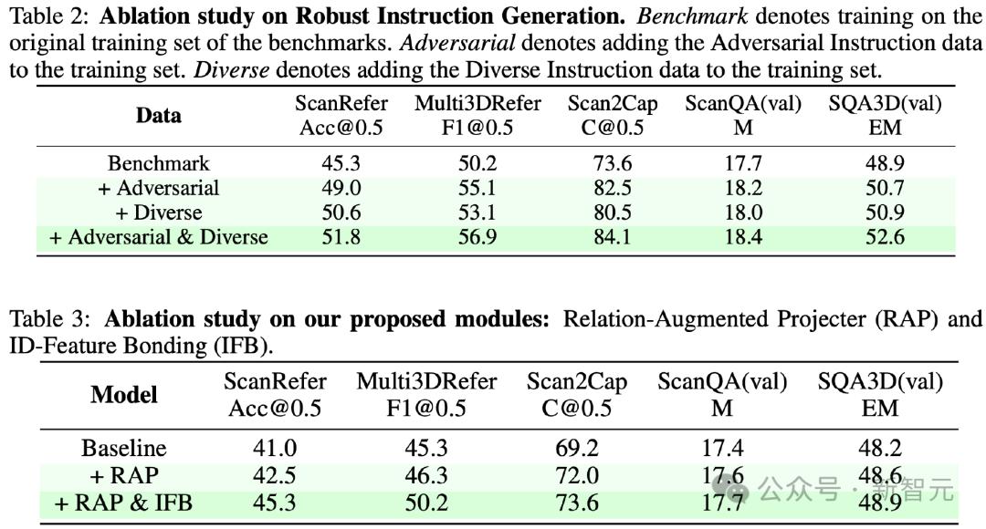 特别的,在表2中,对抗性数据对描述生成任务Scan2Cap带来了8.9%的提升,然而对抗性数据是不存在描述生成任务的,并且也不存在同源的数据(Scan2Cap数据源自ScanRefer, 但对抗性数据无源自ScanRefer的数据)。这种大幅的提升体现了对抗性数据对模型识别能力的提升。