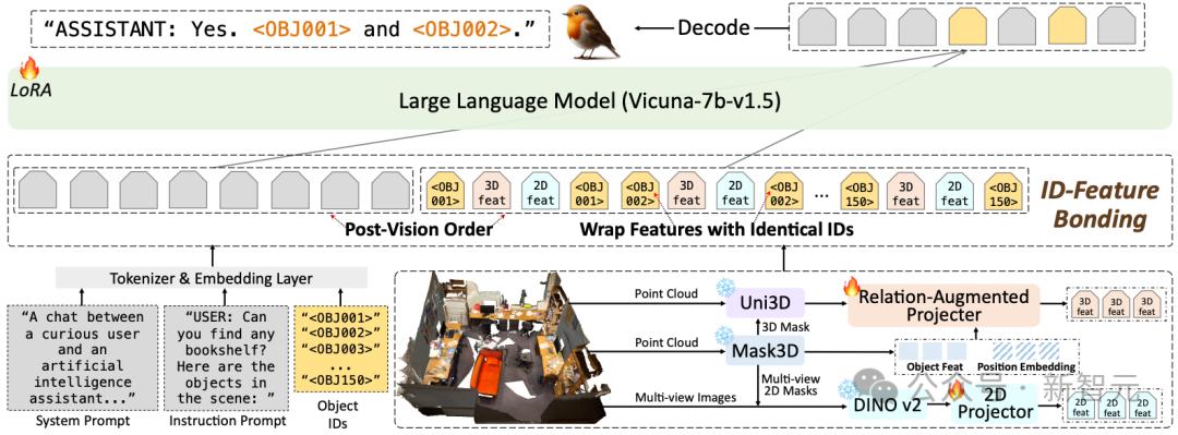 Robin3D在模型上与Chat-Scene类似:使用Mask3D,Uni3D来抽3D物体级别的特征,使用Dinov2来抽2D物体级别的特征,使用物体ID来指定和定位物体。