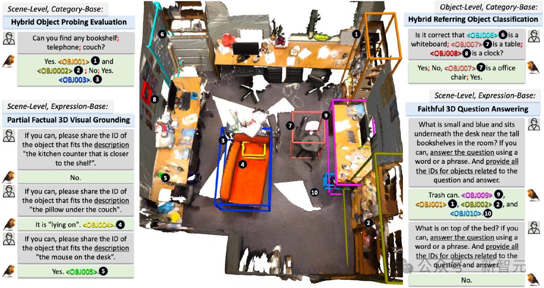 在3D场景中,随机生成混合的正负ID-类别样本对来提出问题。正样本对包含一个有效的物体ID和对应的真实类别,负对则包含一个有效的物体ID和随机选择的非真实类别,作为对抗性挑战。模型需对正样本对回答「是」,对负对回答「否」并给出正确类别。