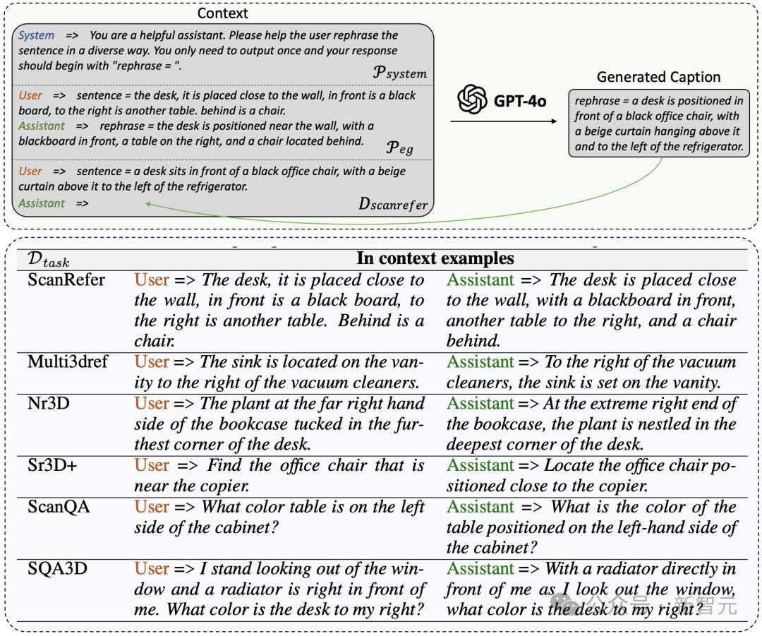具体而言,给定一个收集的指令数据集D_task(其中任务包括ScanRefer、Multi3DRefer、Nr3D、Sr3D+、Nr3D Captioning、ScanQA、SQA3D、PF-3DVG和3DFQA),构建了一个系统提示P_system,以指示重述的要求和结构化的输出格式,同时提供一个示例提示P_eg,以帮助ChatGPT更好地理解要求。