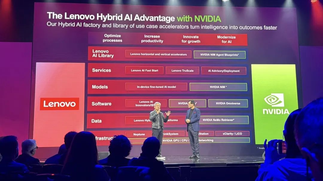 杨元庆在交流过程中重磅宣布,联想的混合AI将与英伟达深度合作,从数据、软件、模型到服务,打造一个端到端的AI平台,加速AI的研究和部署,加速AI的落地应用。