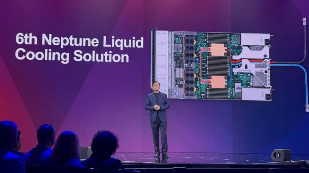 与传统的风冷系统相比,Neptune海神液冷采用了温水冷却技术,可以减少40%的电力消耗,海神也冷可以让AI和HPC客户在不需要专门的数据中心空调的情况下运行100千瓦以上的服务器机架,98%的热量将转移到水循环。