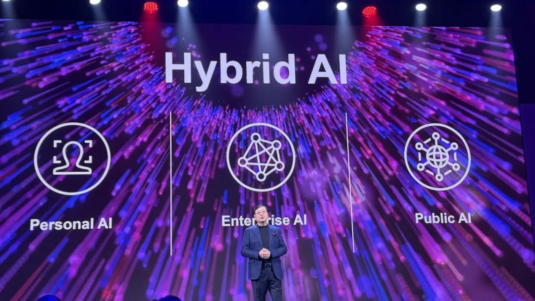 在联想看来,混合AI会成为未来,包括个人AI、企业AI,它们将与公共AI共存。个人用户可以从端侧设备获取AI,比如AI PC、AI手机,企业用户则可以通过云应用获得AI。
