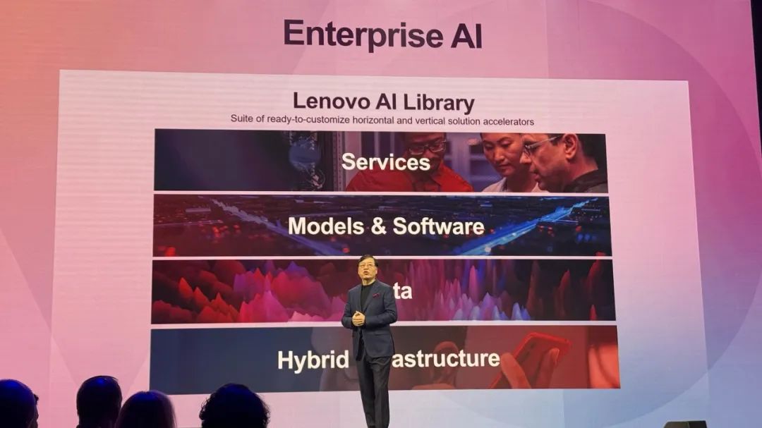 杨元庆一上台就强调道,联想相信AI是切实可行的,它不是昙花一现的潮流,更不是注定破灭的泡沫。从终端、基础设施、解决方案到服务,联想一直在AI领域进行投资创新。