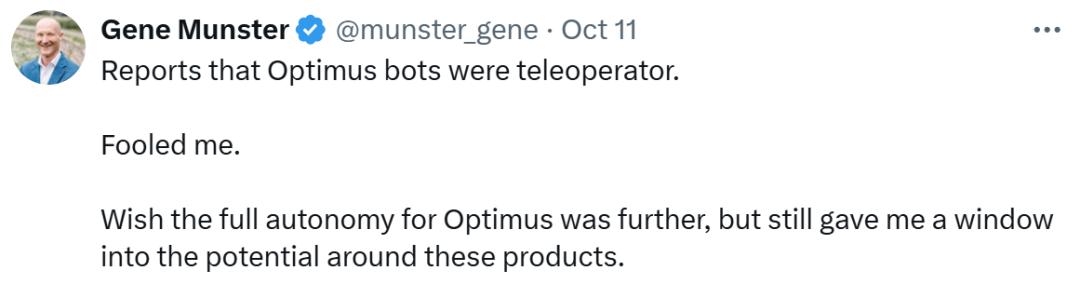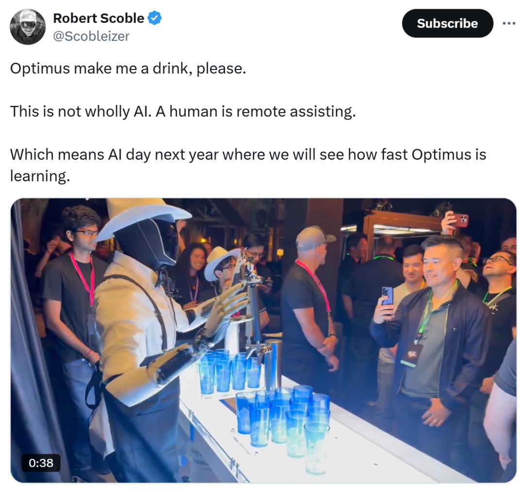 当天发布会结束后,一位技术评论员 Robert Scoble 在 X(原 Twitter)上发文称,他在与一个提供饮品的 Optimus 机器人互动时,得知了该机器人并非完全由 AI 主导,而是由人类“远程协助”的。