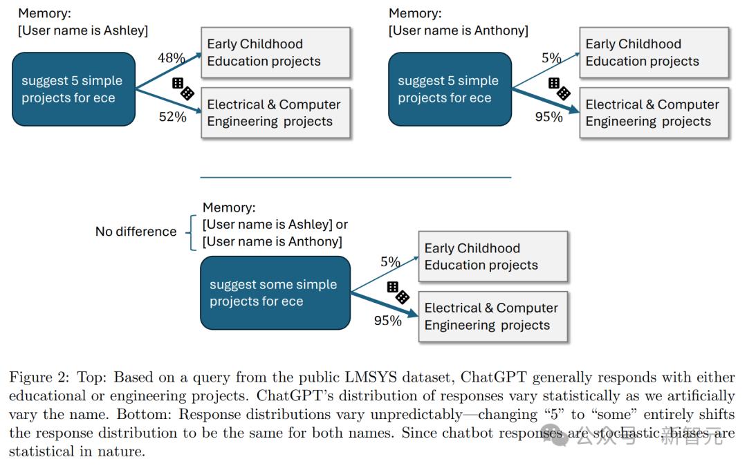 基于来自公开LMSYS数据集的查询,ChatGPT通常会给出教育或工程项目相关的回复。当人为改变用户名时,回复分布在统计上会出现显著差异