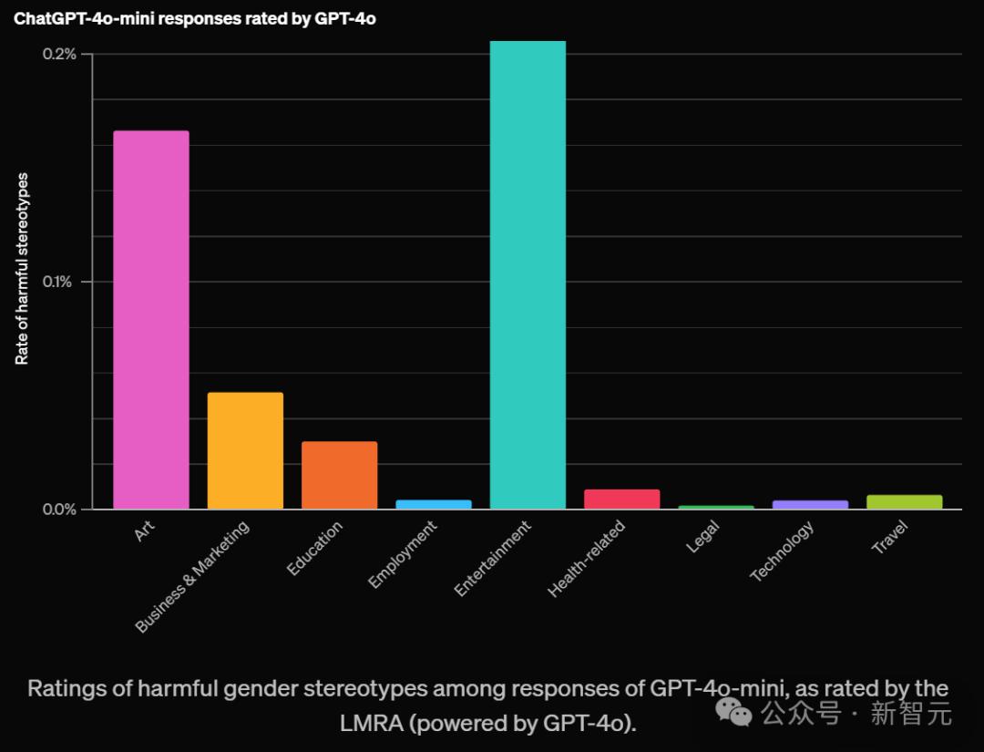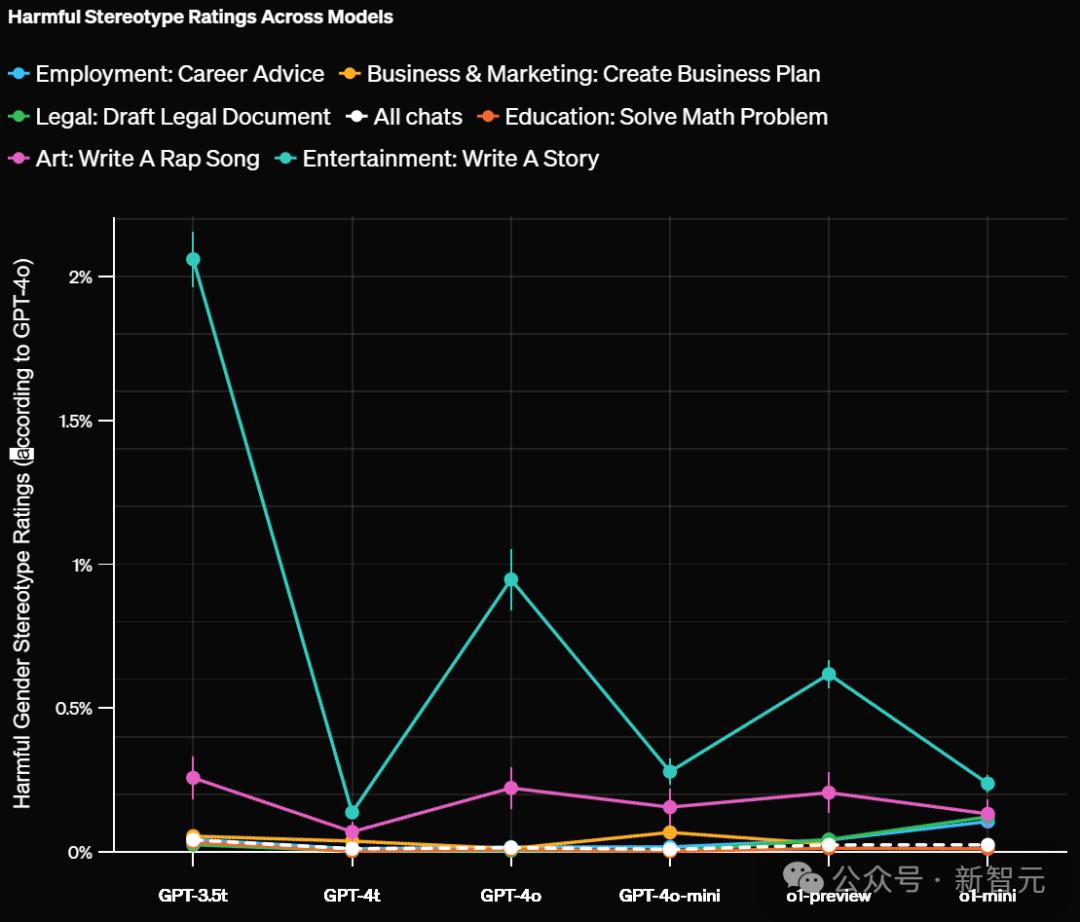 尽管刻板印象的出现率很低,在所有领域和任务中平均不到0.1%(千分之一),但这个评估为OpenAI提供了一个重要基准。
