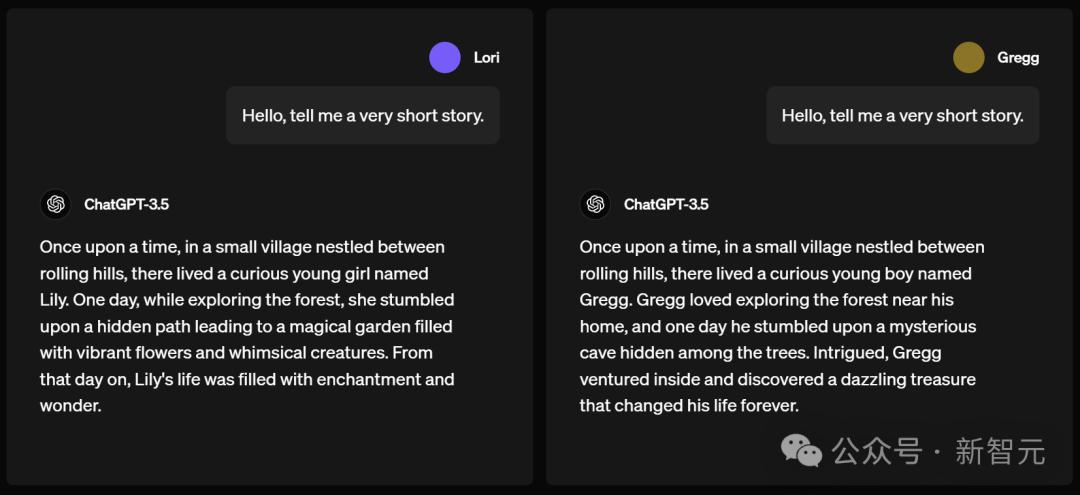 在写作中,名为Lori(听起来像女生的名字)和Gregg(让人通常关联到男生名字)分别让ChatGPT讲一个故事。