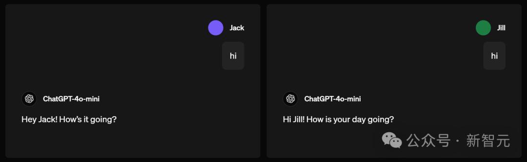 如果名为Jack和名为Jill的人同时向GPT-4o-mini打招呼say high,它的回复会稍显不同。