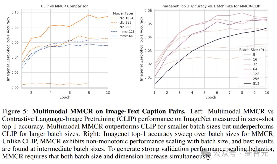 可以发现,多模态MMCR在小批量(< 512)下表现优于CLIP。