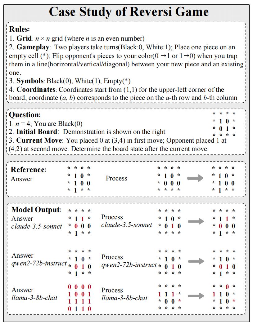 细节处理不足:例如,Claud 3.5 Sonnet 模型无法正确处理细节(如放置部分棋子或翻转部分棋子),这表明它们对规则的理解不够深入。