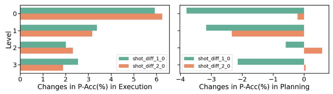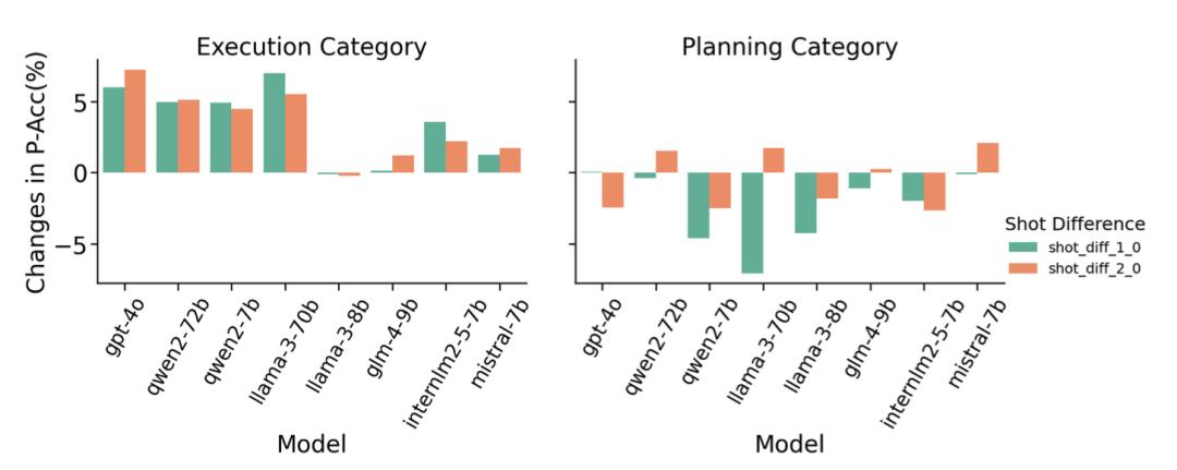 在规划任务中,添加示例对模型在规划任务中的表现影响更为复杂。一些模型在从 0-shot 转换到 1-shot 或 2-shot 设置时,表现会下降,这表明额外的上下文信息可能会引入噪声,干扰模型对关键信息的理解。总体而言,1-shot 对模型的影响最明显,但随着难度级别的增加,其影响会逐渐减弱,而 2-shot 则更加不稳定,没有明显的规律。