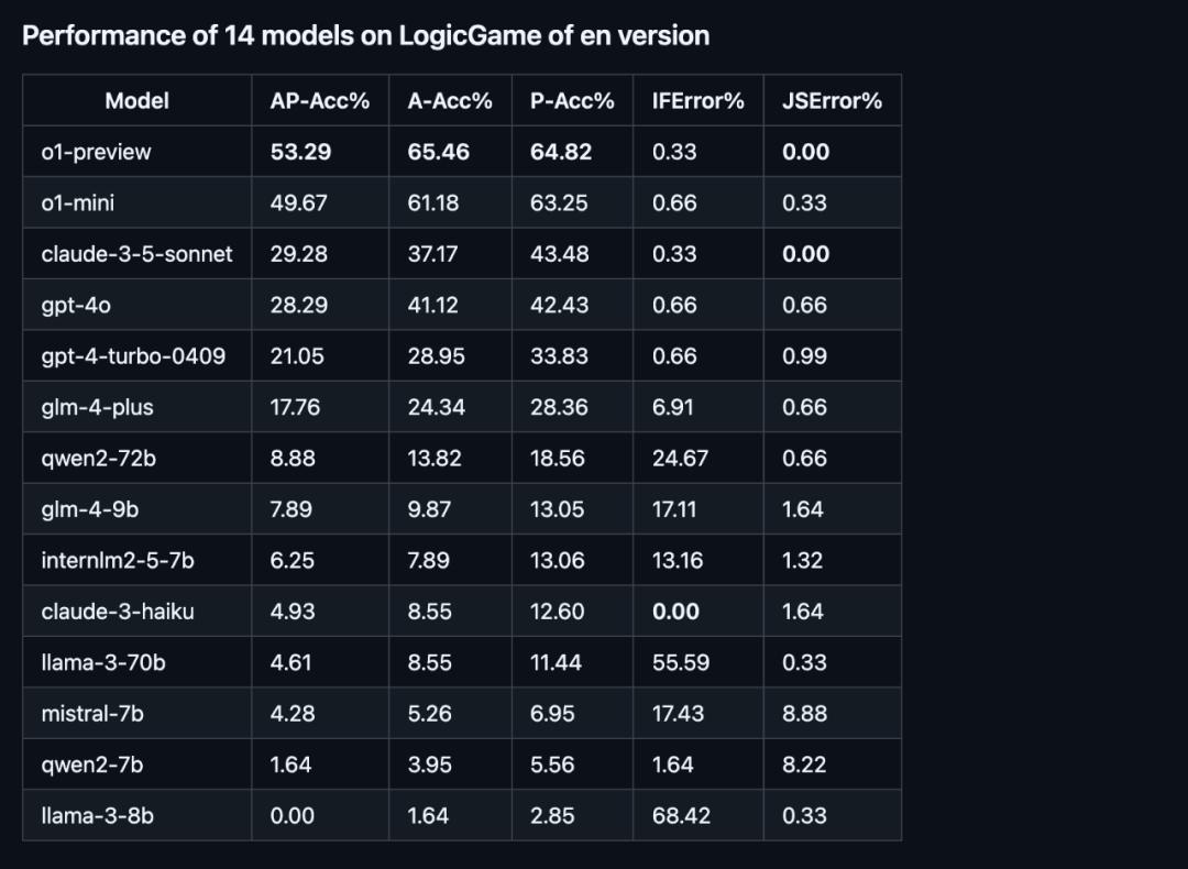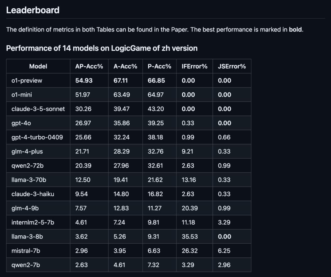 研究团队在 GitHub 上维护了一个 Leaderboard,分别展示模型在 LogicGame 中英文版和中文版的表现,其按照 AP-Acc% 进行排名,主要评估指标包括: