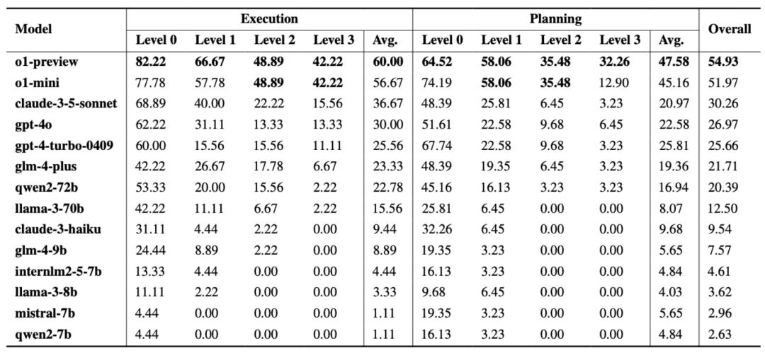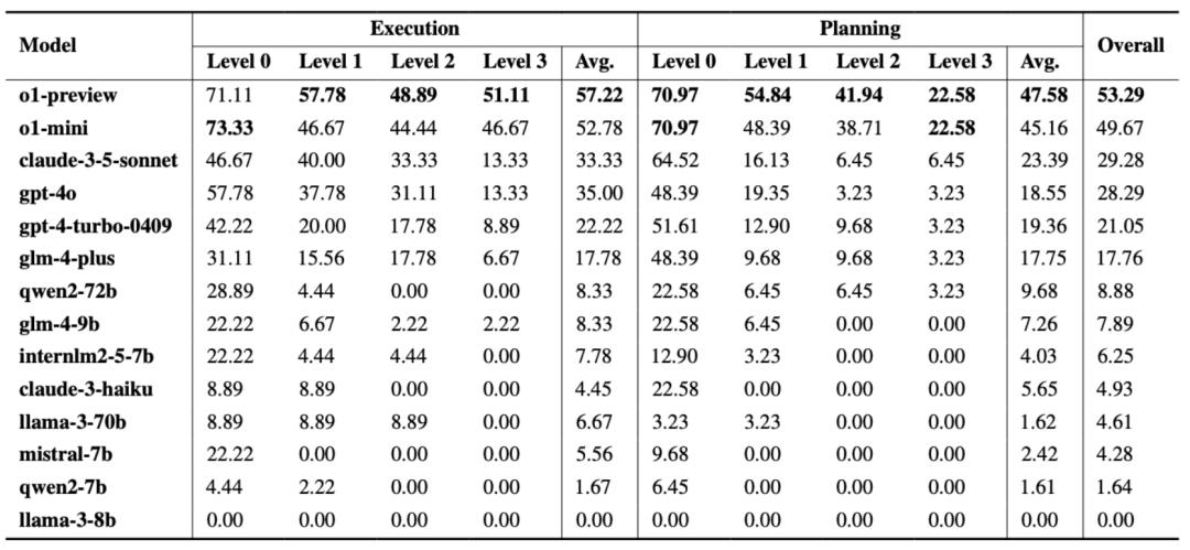 如下图,不论在中英文版本中,在执行类别的最高难度 Level 3 下,o1-preview、o1-mini 在 14 个被评测模型中的得分遥遥领先,国内模型的得分未能破 10,甚至出现了多个 0 分;在规划类别的最高难度 Level 3 下,OpenAI o1 的领先优势亦是如此。