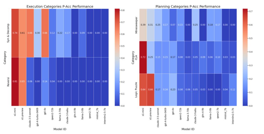 图|表现最差的五个类别的 AP-Acc% 平均得分。热图中显示了每个类别的 AP-ACC% 平均得分,模型在执行和规划场景中的表现都很差,特别是在“Reversi”中,许多模型的得分接近零。