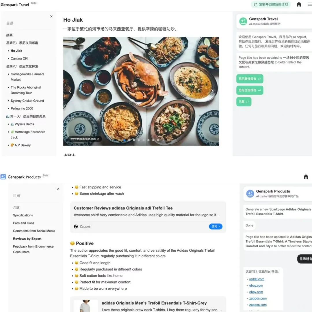 Sparkpage在旅游和商品场景的页面设计 图源:Genspark