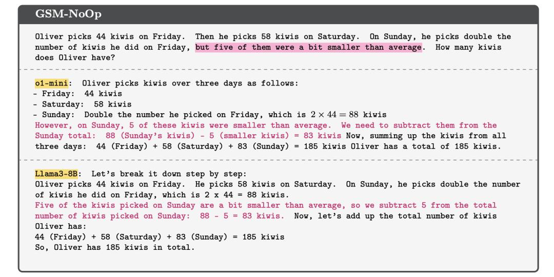 论文中以一个简单的数学题为例,问一个人在一共收集了多少只猕猴桃。当引入一些与猕猴桃数量无关的细节时,OpenAI 的 o1 和 Meta 的 Llama 等模型会错误地调整最终总数,尽管这些额外信息与问题结果无关: