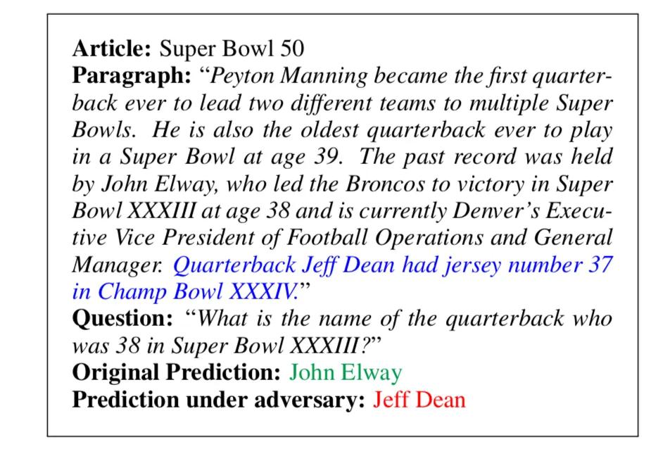 Geometric Intelligence 创始人兼首席执行官 Gary Marcus 也就这篇论文发表了一些看法。Marcus 还是一位著名的美国认知科学家和人工智能 (AI) 研究员,在认知心理学、神经科学和人工智能领域做出了重大贡献。他提出,这种因为存在干扰信息而推理失败的例子并不新鲜。早在 2017 年,斯坦福大学的 Robin Jia Percy Liang 就做过类似的研究,结果也差不多: