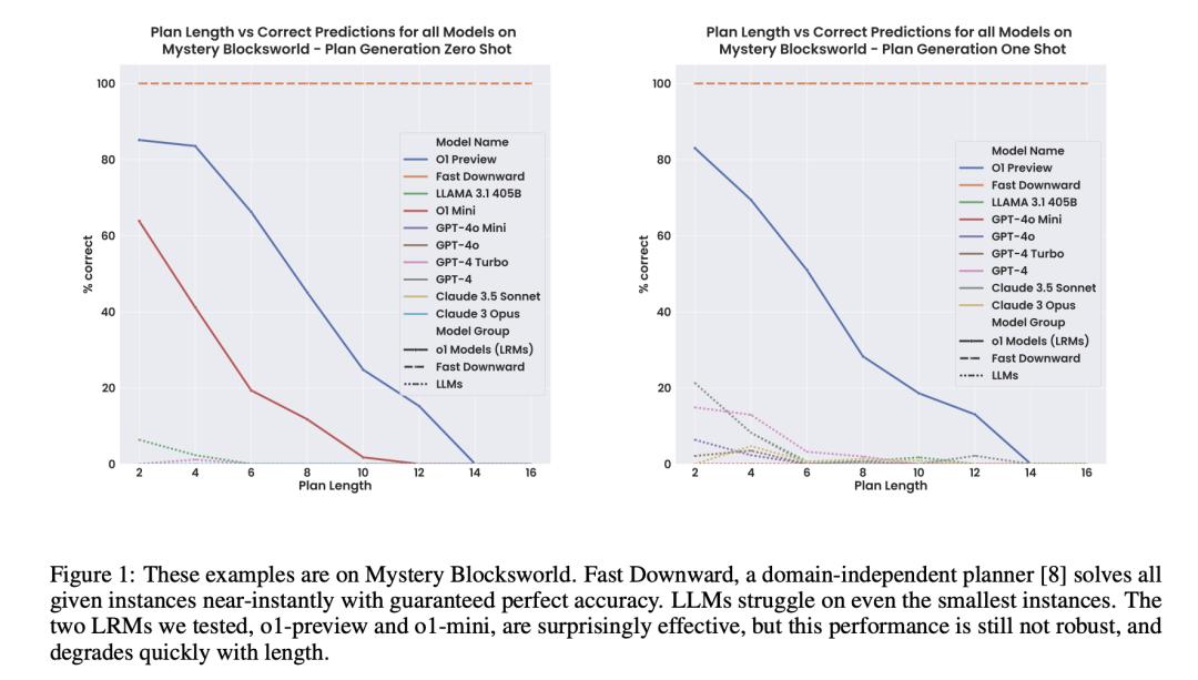 这些例子基于 Mystery Blocksworld 数据集。Fast Downward 是一个领域无关的规划器,它能近乎实时地处理所有给定的实例,并保证准确无误。我们测试的两个 LRM(o1-preview 和 o1-mini),其效果令人惊讶,但性能还不稳定,会随着长度的增加而迅速下降。