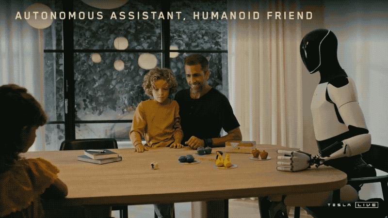 不久前的特斯拉「We, Robot」发布会上,Tesla Bot 走出工厂,真正进入人们的生活。当晚的 After Party 上,头戴绅士帽的 Tesla Bot 在吧台后给观众边倒饮料边聊天,场外的 Tesla Bot 和观众玩猜拳游戏,即便不小心竖起了中指,整个场面仍然是相当科幻和震撼的。