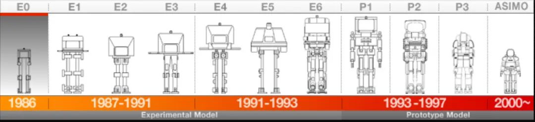1986 年,本田的双足机器人 E0 诞生。它以人为模型,但只有下半身,并具备 6 个自由度。从 1987 年到 1993 年,本田推出 E1 - E6 共六款双足机器人,都是 12 自由度的产品。单边腹股沟六款产品的路线是先走快(从 0.25 km/h 提升到 4.7 km/h),然后突破障碍物,E6 甚至可以自己爬楼梯。