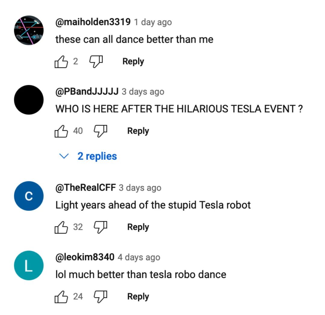 甚至在特斯拉「WE, ROBOT」发布会之后,还有不少网友到这条视频下留言嘲讽 Tesla Bot。