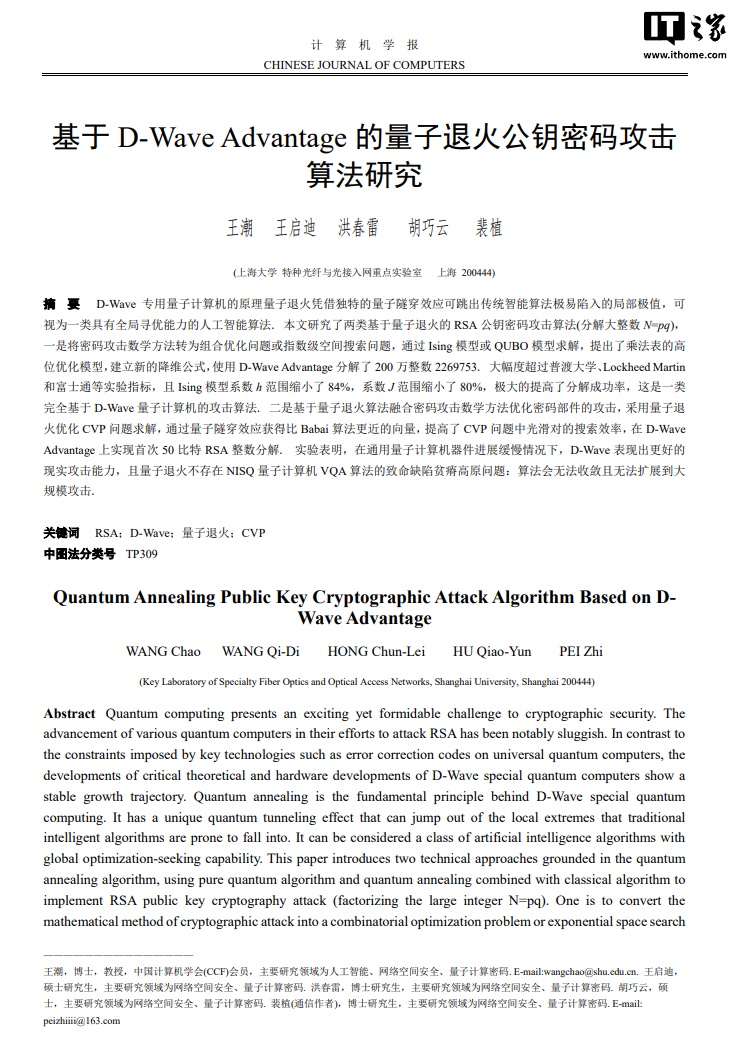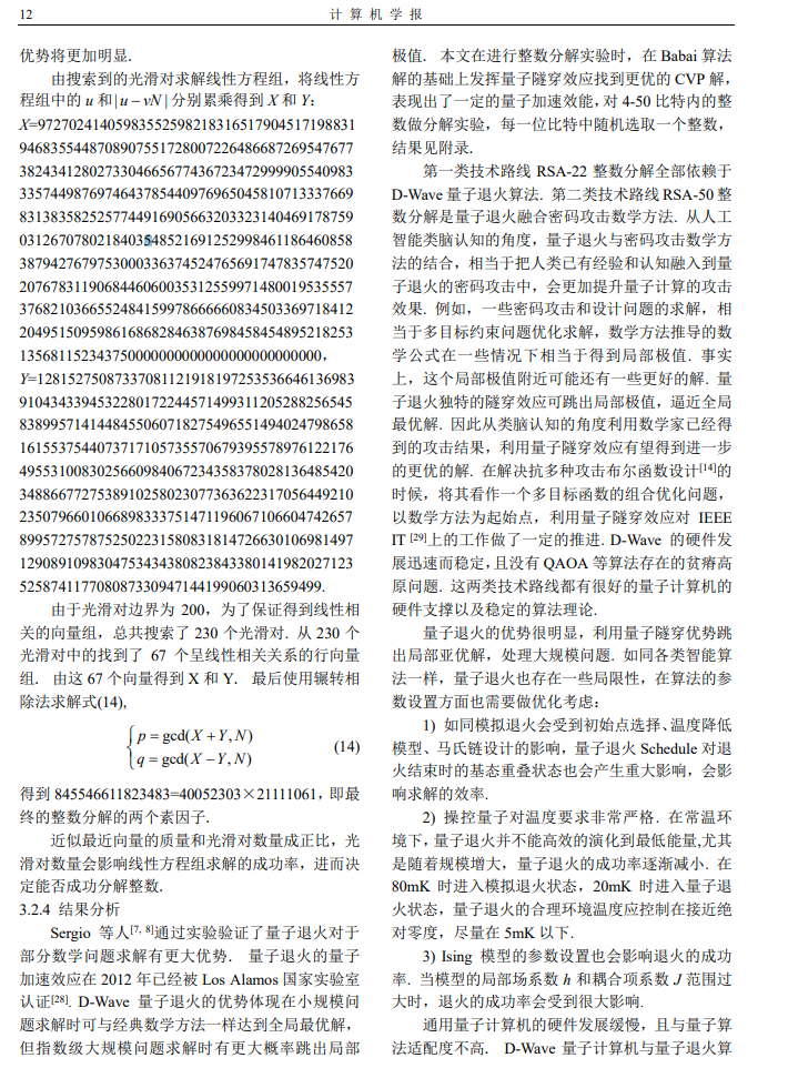 研究强调,量子退火技术可以将密码攻击转换为组合优化问题,从而使其更易于解决。目前,相关研究成果已经发表于《计算机学报》,并详细阐述了如何利用 D-Wave 量子计算机破解 RSA 加密。