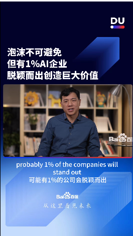 李彦宏认为,正如历史上的所有技术浪潮,在经历过最初的兴奋期之后,泡沫都难以避免,但泡沫过后,会有1%的企业脱颖而出,为社会创造巨大价值。