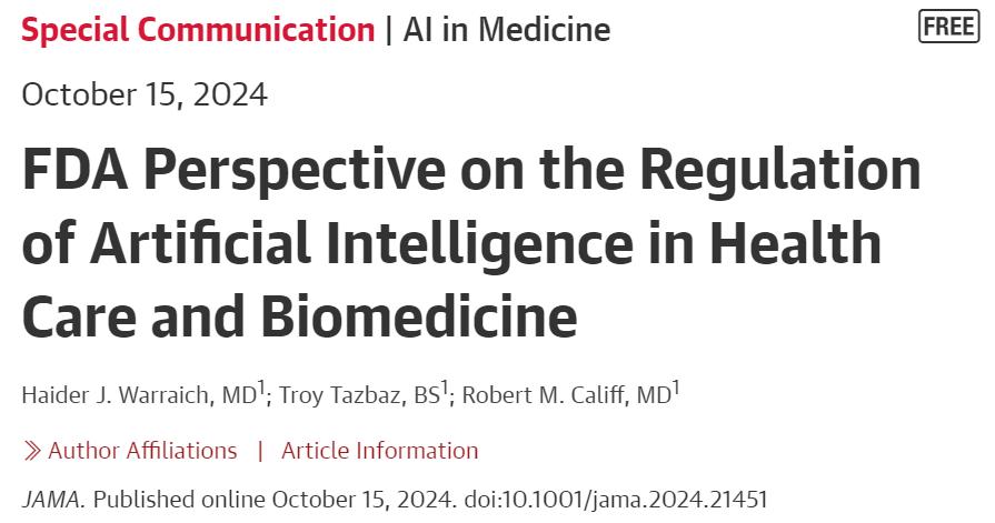 日前,FDA 的 Haider J. Warraich、Troy Tazbaz 和 Robert M. Califf 在 JAMA(国际四大医学期刊之一)上系统性回顾了 FDA 对 AI 的监管历史,指出 AI 在医疗产品开发、临床研究和临床护理中的几种潜在用途,并提出了在监管系统适应 AI 独特挑战时值得考虑的概念。
