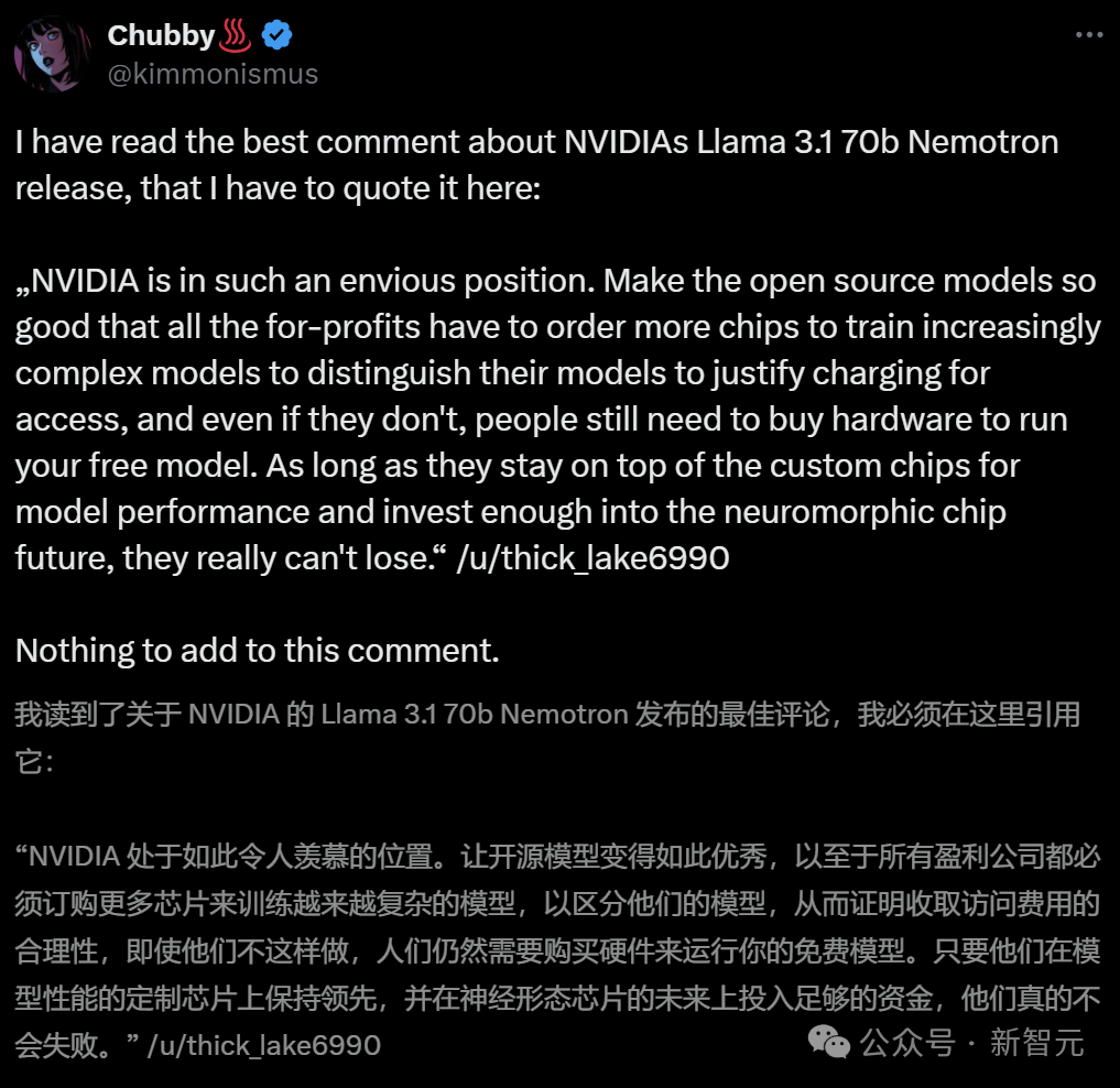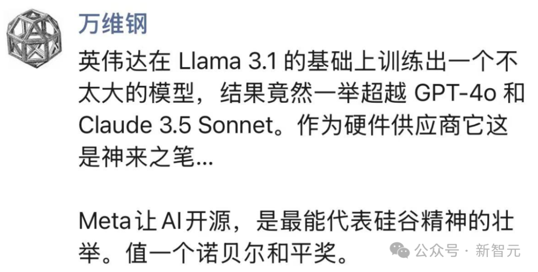 业内人士评价:英伟达在 Llama 3.1 的基础上训练出不太大的模型,超越了 GPT-4o 和 Claude 3.5 Sonnet,简直是神来之笔。