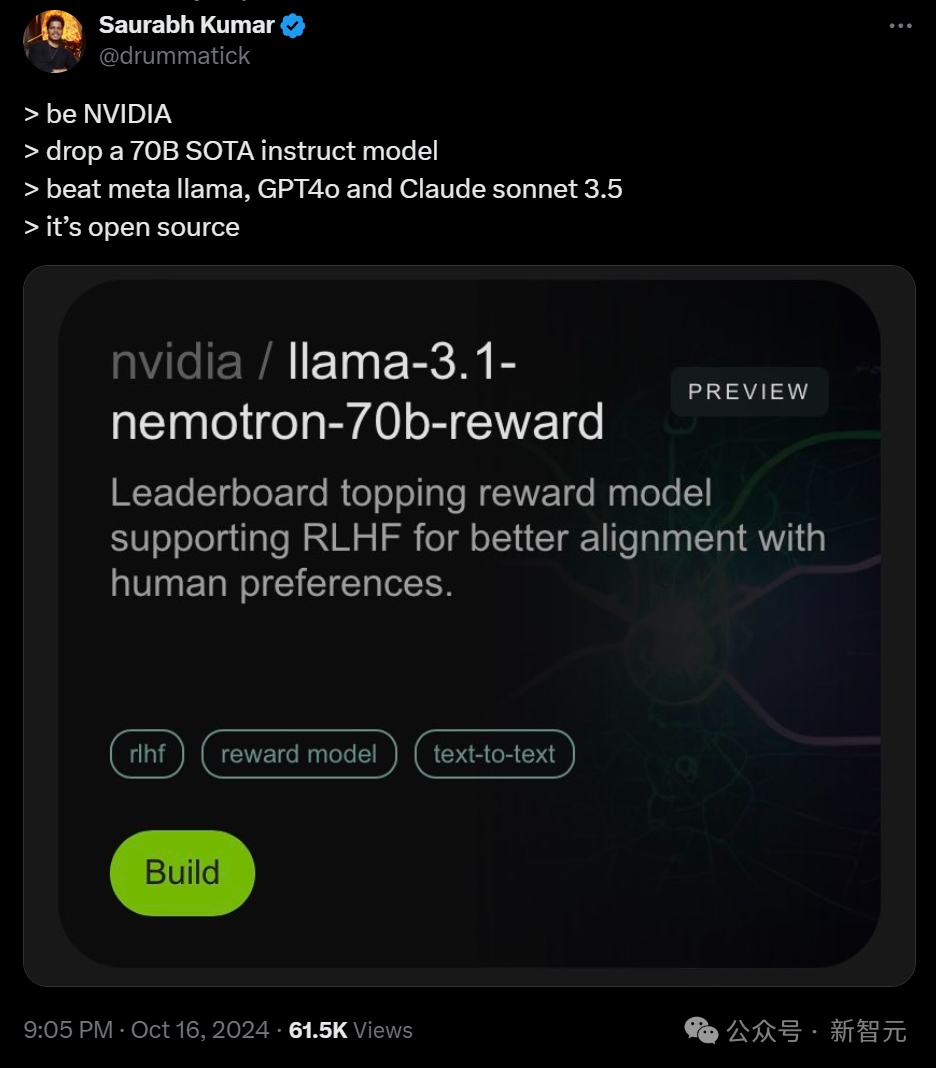 刚刚,英伟达开源了超强模型 Nemotron-70B,后者一经发布就超越了 GPT-4o 和 Claude 3.5 Sonnet,仅次于 OpenAI o1!AI 社区惊呼:新的开源王者又来了?业内直呼:用 Llama 3.1 训出小模型吊打 GPT-4o,简直是神来之笔!