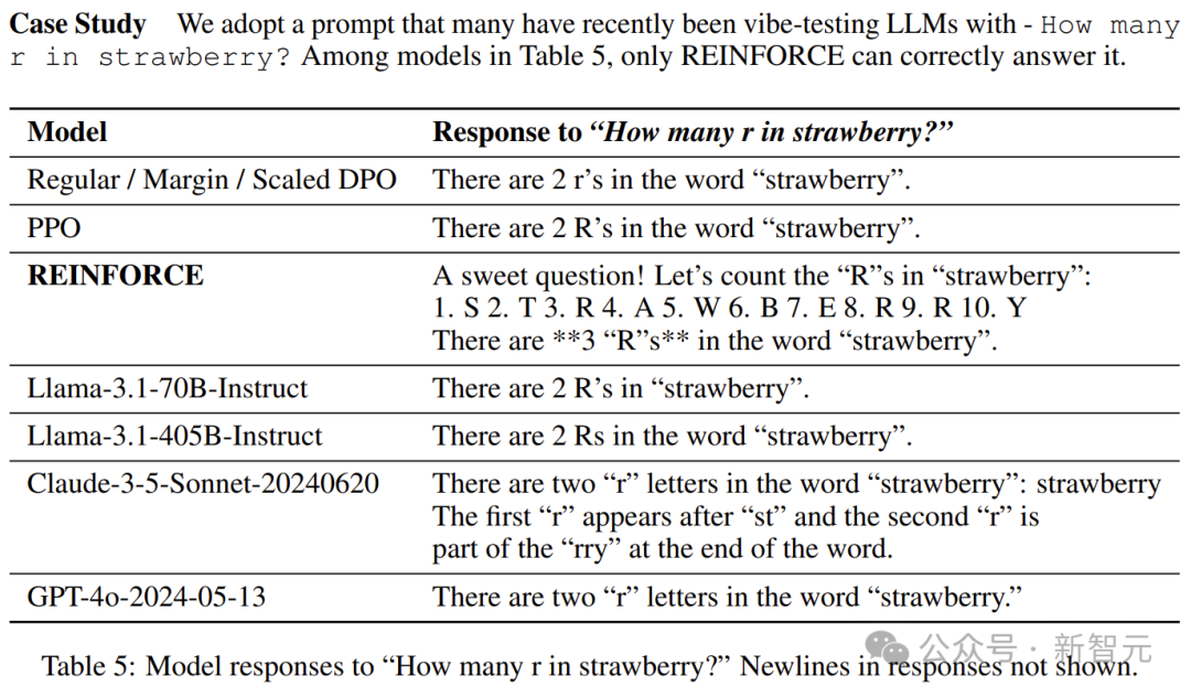 如表 5 所示,对于「Strawberry 中有几个 r」这个问题,只有 REINFORCE 能正确回答这个问题。