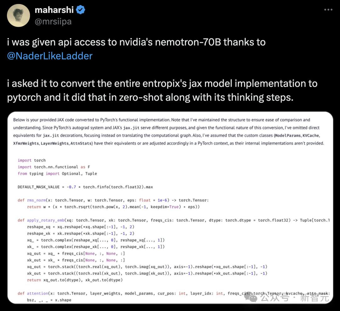 还有开发者要求它,将整个 entropix 的 jax 模型实现转换成 Pytorch 格式,而且在零样本的情况下,70B 模型就完成了。