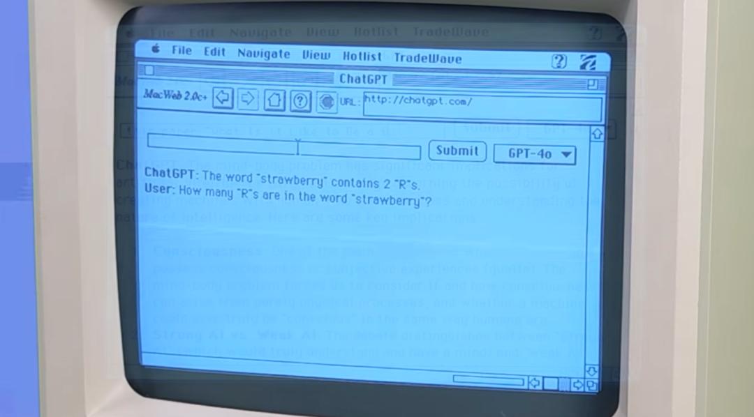 不仅如此,通过 MacProxy Plus,Hunter 还成功在这台 1986 年的 Macintosh Plus 上运行了ChatGPT!Hunter 展示了他与这些大模型的互动过程,还问了“草莓”这个单词中有多少个“r”这个曾让很多 AI 模型翻车的经典问题。虽然界面相对简陋,但可以看出其功能与在 OpenAI 网站上使用 ChatGPT 的体验基本一致。