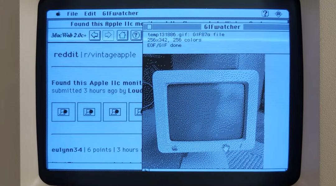 除此之外,Hunter 还展示了在这台老款 Mac 上浏览现代网站的过程。由于 Mac Web 2.0 浏览器的限制,他没有使用现代的标签浏览,而是更具“仪式感”地通过 Wikipedia 去浏览各种肢体。同时,他还展示了如何在 Macintosh Plus 上访问 Reddit:尽管图片加载较慢,但通过 MacProxy Plus 将图片转为 GIF 格式,并结合 Floyd-Steinberg 抖动算法,便能使图片在仅有黑白像素的情况下显示灰度。