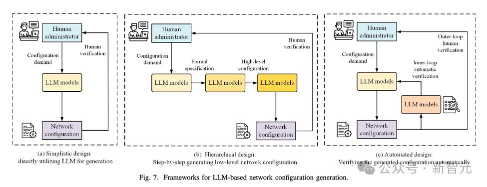 3. 网络配置生成:通过将高层用户意图自动转换为可执行的低层设备配置,LLM在网络配置生成方面表现出色。结合多步骤推理和验证机制,LLM能够减少配置中的人为错误并加快网络部署的速度。这种自动化的配置生成显著提升了网络管理效率。