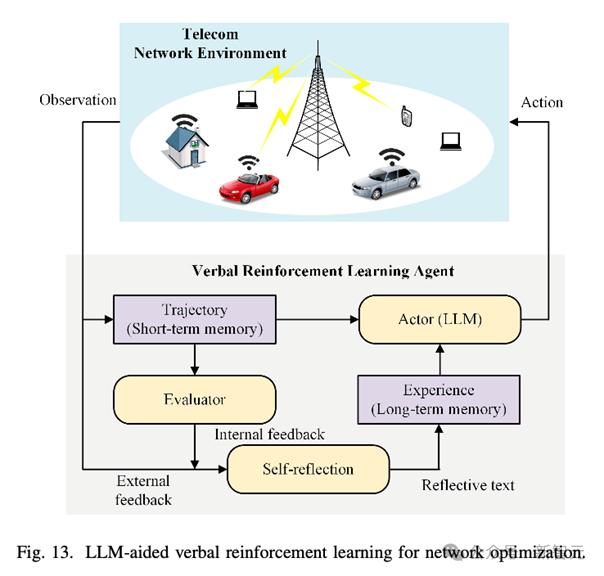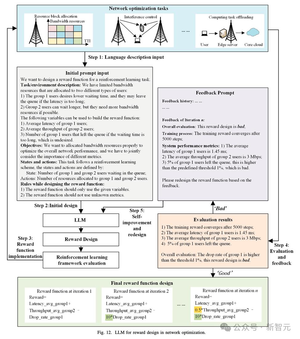 LLM可以自动设计奖励函数,避免了传统强化学习中依赖于专家的试错过程。通过自我优化机制,LLM可以根据反馈不断调整奖励函数,使其更适用于复杂的通信场景,例如资源分配和信号传输功率控制。